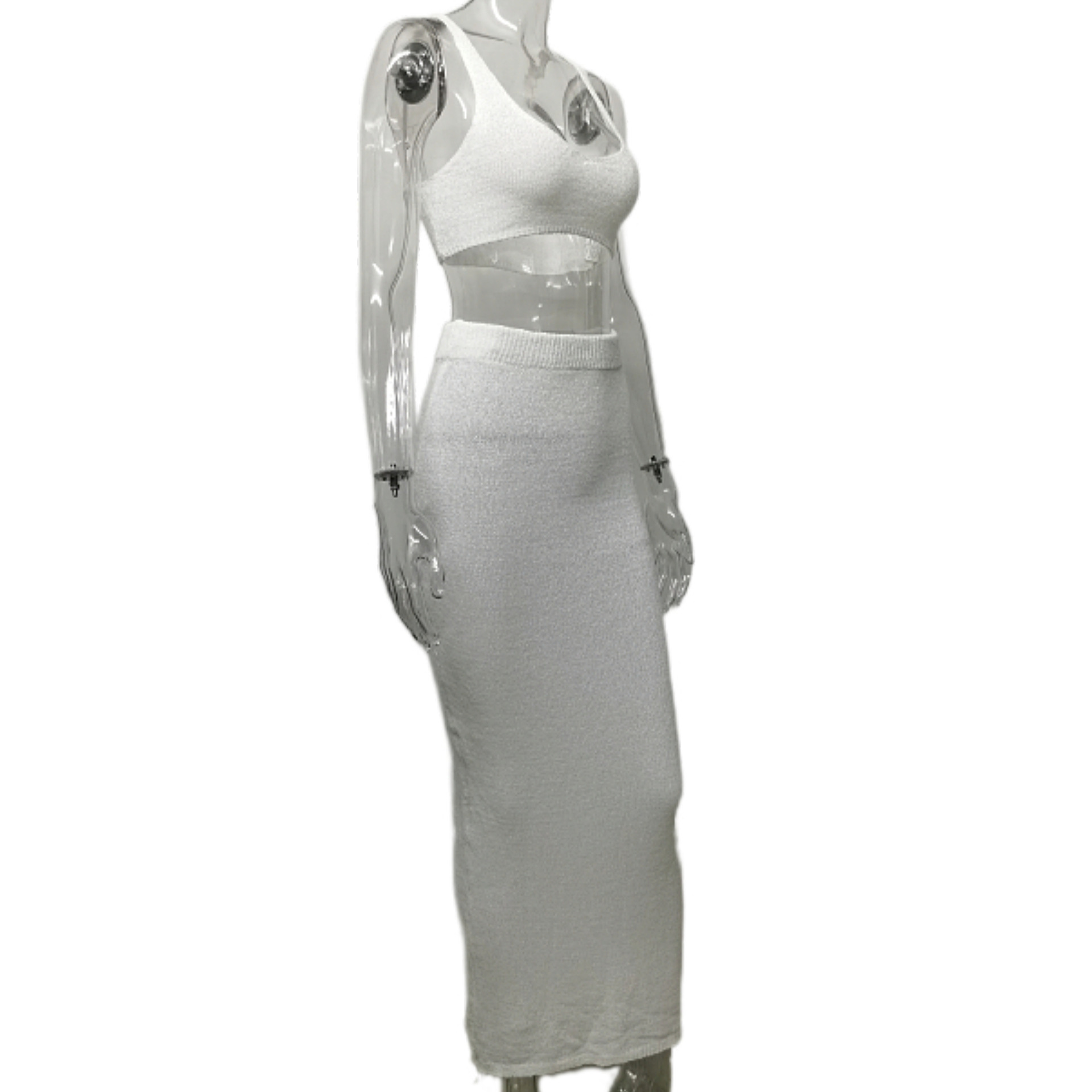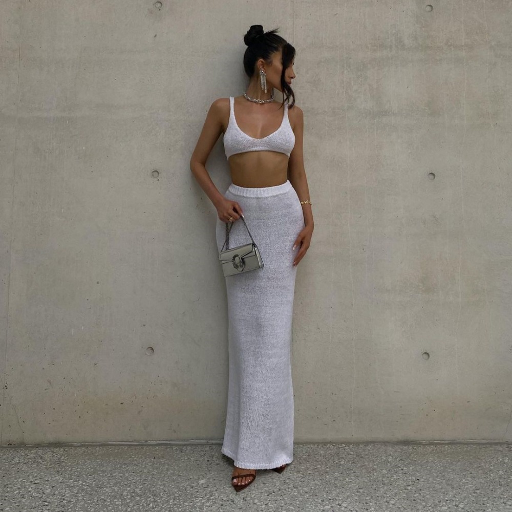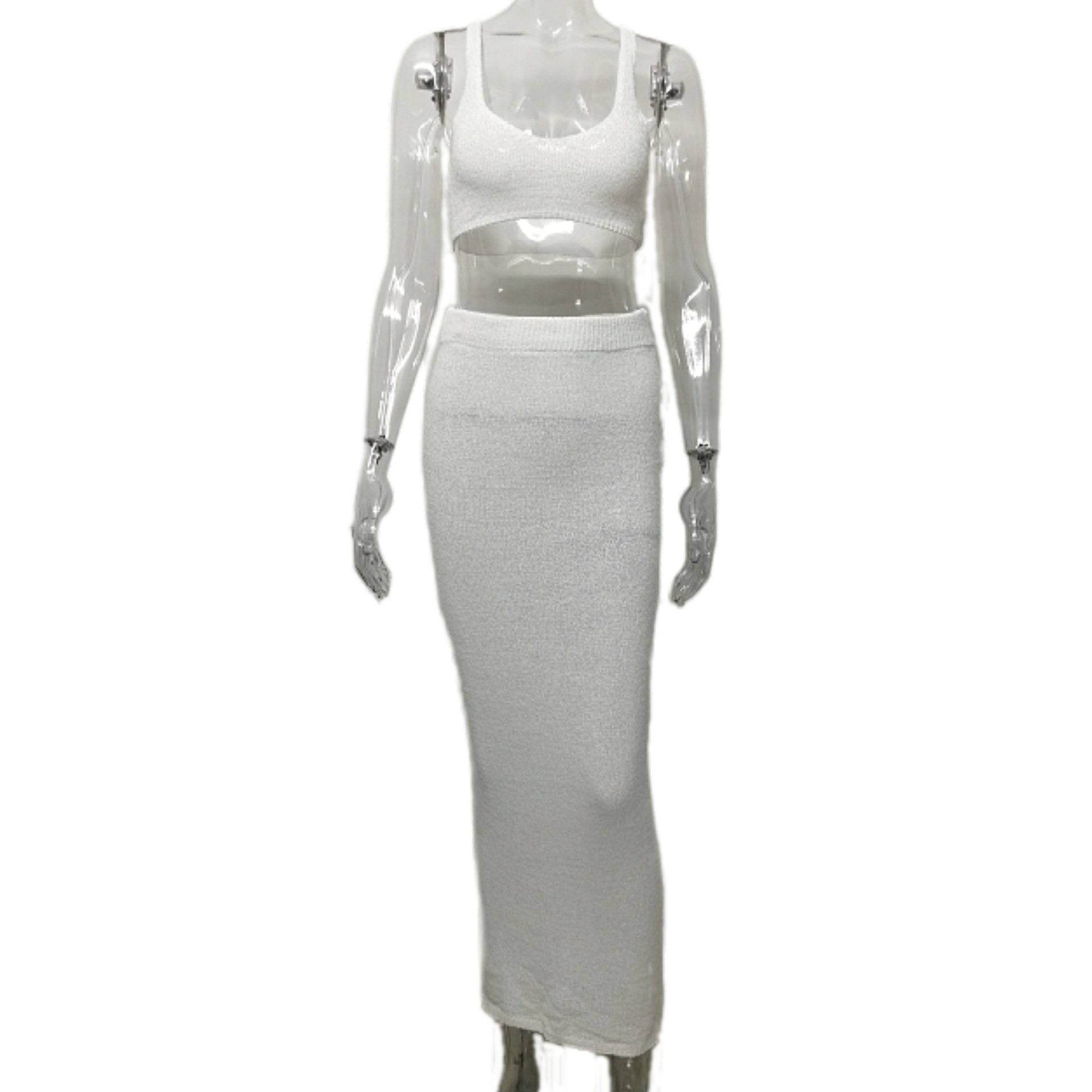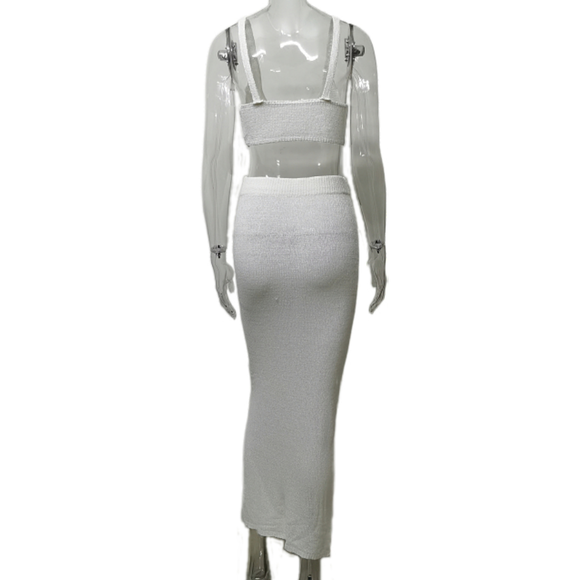 New Style Knitted Fashionable Womens Strappy Tube Top And Solid-Colored Sheath Maxi Dress Two-Piece Set
